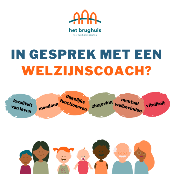 Heb je vragen op het gebied van bijvoorbeeld zingeving, meedoen, dagelijks functioneren, vitaliteit of mentaal welbevinden? Loop dan gerust eens binnen bij het Brughuis voor een vrijblijvend gesprek. Er is altijd een welzijnscoach aanwezig om met je in gesprek te gaan op: